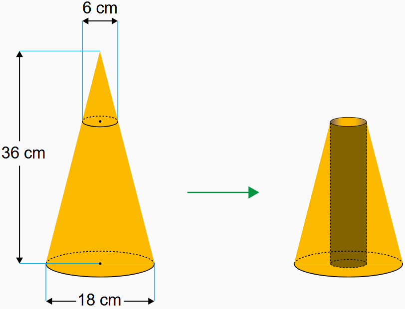Um artista plástico esculpe uma escultura a partir de um bloco de madeira de lei, em etapas. Inicialmente, esculpe um cone reto com 36 cm de altura e diâmetro da base medindo 18 cm. Em seguida, remove desse cone um cone menor, cujo diâmetro da base mede 6 cm, obtendo, assim, um tronco de cone, conforme ilustrado na figura.