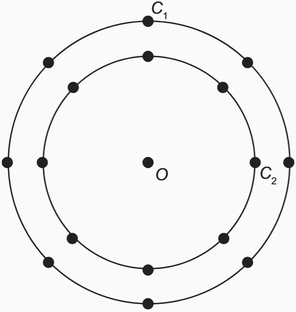 A figura é uma representação simplificada do carrossel de um parque de diversões, visto de cima. Nessa representação, os cavalos estão identificados pelos pontos escuros, e ocupam circunferências de raios 3 m e 4 m, respectivamente, ambas centradas no ponto O. Em cada sessão de funcionamento, o carrossel efetua 10 voltas.