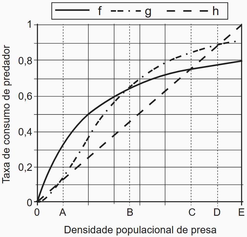 O modelo predador-presa consiste em descrever a interação entre duas espécies, sendo que uma delas (presa) serve de alimento para a outra (predador). A resposta funcional é a relação entre a taxa de consumo de um predador e a densidade populacional de sua presa. A figura mostra três respostas funcionais (f, g, h), em que a variável independente representa a densidade populacional da presa.