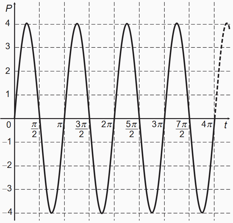 Os movimentos ondulatórios (periódicos) são representados por equações do tipo \(\pm A \sin(\omega t + \theta)\), que apresentam parâmetros com significados físicos importantes, tais como a frequência \(\omega = \frac{2\pi}{T}\), em que T é o período; A é a amplitude ou deslocamento máximo; \(\theta\) é o ângulo de fase \(0 \le \theta < \frac{2\pi}{\omega}\), que mede o deslocamento no eixo horizontal em relação à origem no instante inicial do movimento. O gráfico representa um movimento periódico, P = P(t), em centímetro, em que P é a posição da cabeça do pistão do motor de um carro em um instante t, conforme ilustra a figura.