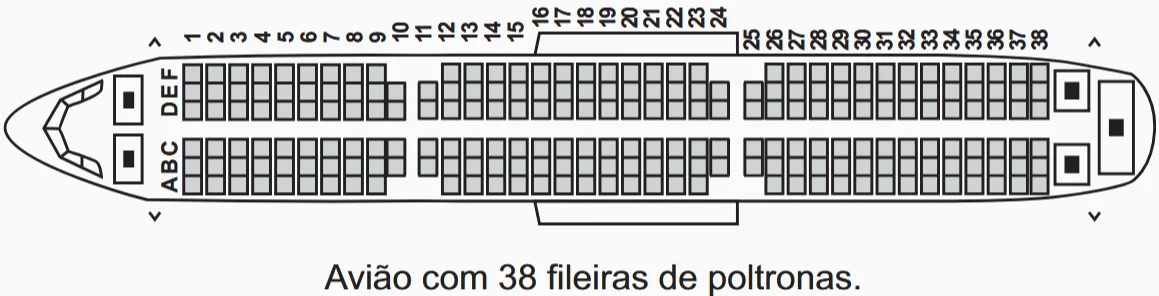 Uma empresa aérea lança uma promoção de final de semana para um voo comercial. Por esse motivo, o cliente não pode fazer reservas e as poltronas serão sorteadas aleatoriamente. A figura mostra a posição dos assentos no avião:
