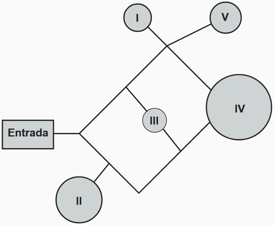 Um adolescente vai a um parque de diversões tendo, prioritariamente, o desejo de ir a um brinquedo que se encontra na área IV, dentre as áreas I, II, III, IV e V existentes. O esquema ilustra o mapa do parque, com a localização da entrada, das cinco áreas com os brinquedos disponíveis e dos possíveis caminhos para se chegar a cada área. O adolescente não tem conhecimento do mapa do parque e decide ir caminhando da entrada até chegar à área IV.
