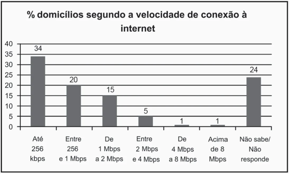 O gráfico mostra a velocidade de conexão à internet utilizada em domicílios no Brasil. Esses dados são resultado da mais recente pesquisa, de 2009, realizada pelo Comitê Gestor da Internet (CGI).