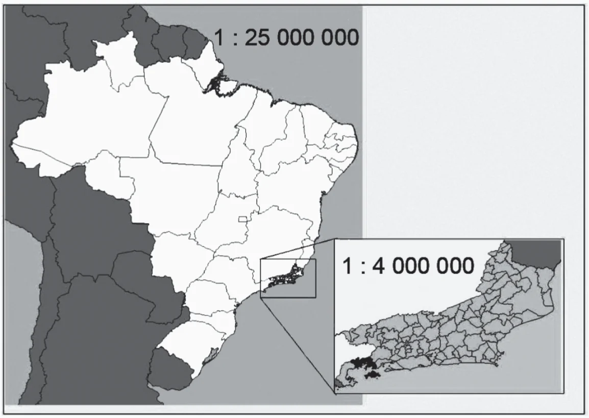 A figura apresenta dois mapas, em que o estado do Rio de Janeiro é visto em diferentes escalas.