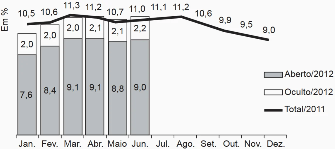 O gráfico apresenta as taxas de desemprego durante o ano de 2011 e o primeiro semestre de 2012 na região metropolitana de São Paulo. A taxa de desemprego total é a soma das taxas de desemprego aberto e oculto.