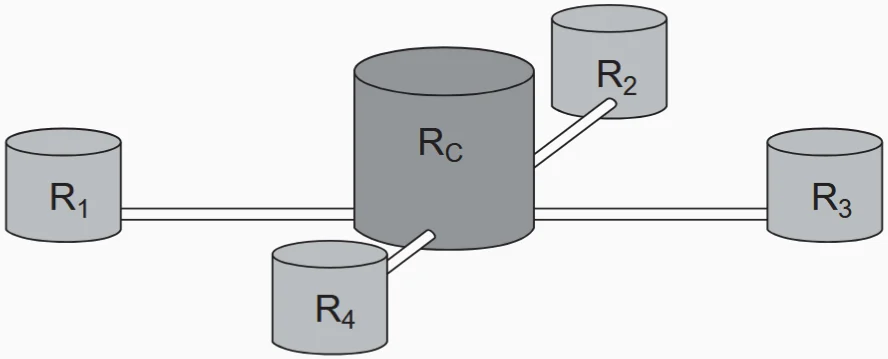 Uma construtora pretende conectar um reservatório central (\(R_c\)) em formato de um cilindro, com raio interno igual a 2 m e altura interna igual a 3,30 m, a quatro reservatórios cilíndricos auxiliares (\(R_1, R_2, R_3\) e \(R_4\)), os quais possuem raios internos e alturas internas medindo 1,5 m.