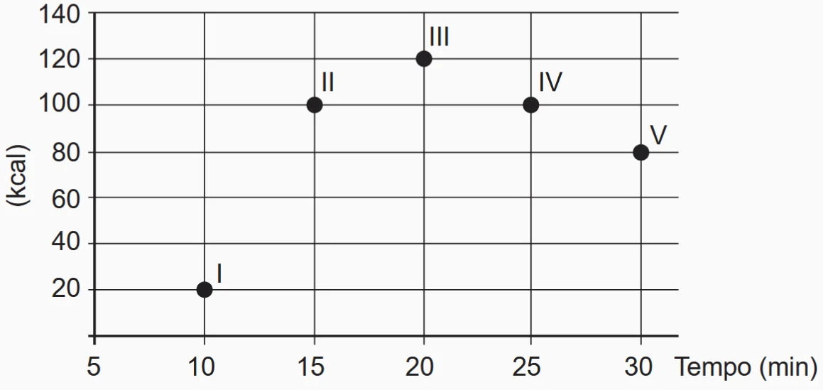 Os exercícios físicos são recomendados para o bom funcionamento do organismo, pois aceleram o metabolismo e, em consequência, elevam o consumo de calorias. No gráfico, estão registrados os valores calóricos, em kcal, gastos em cinco diferentes atividades físicas, em função do tempo dedicado às atividades, contado em minuto.