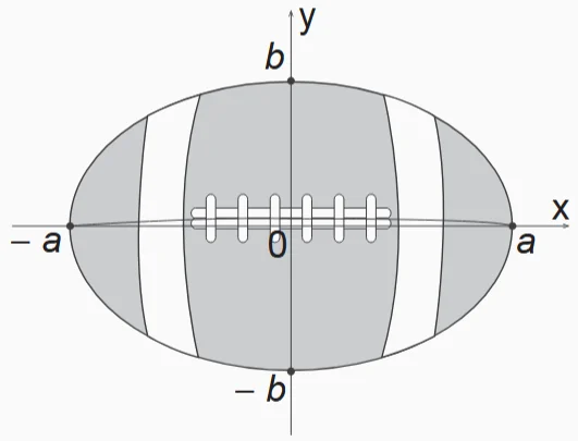 A figura representa a vista superior de uma bola de futebol americano, cuja forma é um elipsoide obtido pela rotação de uma elipse em torno do eixo das abscissas. Os valores a e b são, respectivamente, a metade do seu comprimento horizontal e a metade do seu comprimento vertical. Para essa bola, a diferença entre os comprimentos horizontal e vertical é igual à metade do comprimento vertical.