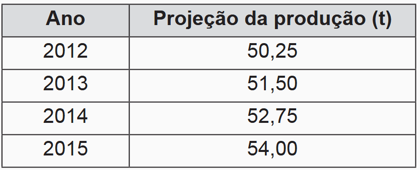 As projeções para a produção de arroz no período de 2012-2021, em uma determinada região produtora, apontam para uma perspectiva de crescimento constante da produção anual. O quadro apresenta a quantidade de arroz, em toneladas, que será produzida nos primeiros anos desse período, de acordo com essa projeção.