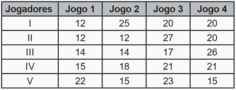 Nos cinco jogos finais da última temporada, com uma média de 18 pontos por jogo, um jogador foi eleito o melhor do campeonato de basquete. Na atual temporada, cinco jogadores têm a chance de igualar ou melhorar essa média. No quadro estão registradas as pontuações desses cinco jogadores nos quatro primeiros jogos das finais deste ano.