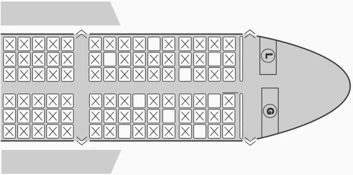 Uma família composta por sete pessoas adultas, após decidir o itinerário de sua viagem, consultou o site de uma empresa aérea e constatou que o voo para a data escolhida estava quase lotado. Na figura, disponibilizada pelo site, as poltronas ocupadas estão marcadas com X e as únicas poltronas disponíveis são as mostradas em branco.
