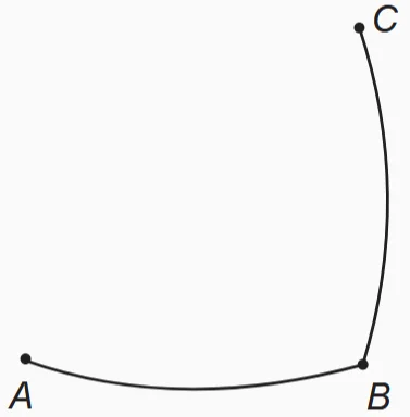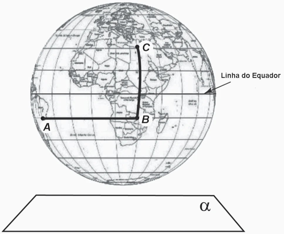 A figura representa o globo terrestre e nela estão marcados os pontos A, B e C. Os pontos A e B estão localizados sobre um mesmo paralelo, e os pontos B e C, sobre um mesmo meridiano. É traçado um caminho do ponto A até C, pela superfície do globo, passando por B, de forma que o trecho de A até B se dê sobre o paralelo que passa por A e B e, o trecho de B até C se dê sobre o meridiano que passa por B e C. Considere que o plano α é paralelo à linha do equador na figura.