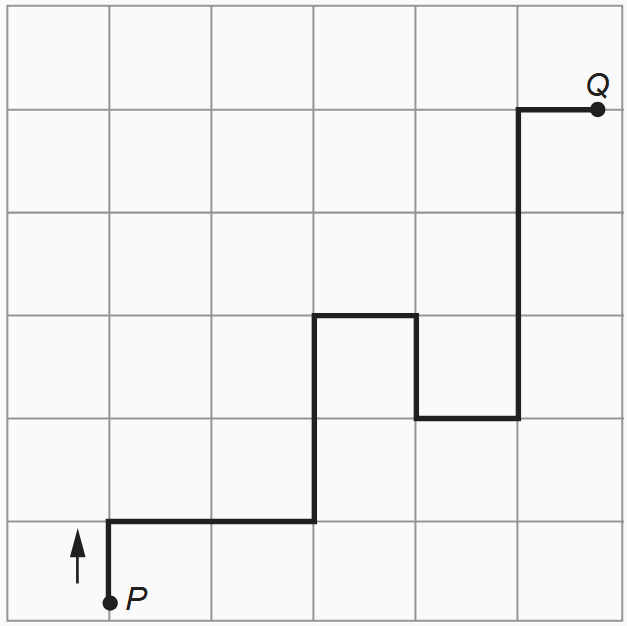Uma pessoa precisa se deslocar de automóvel do ponto P para o ponto Q, indicados na figura, na qual as linhas verticais e horizontais simbolizam ruas.