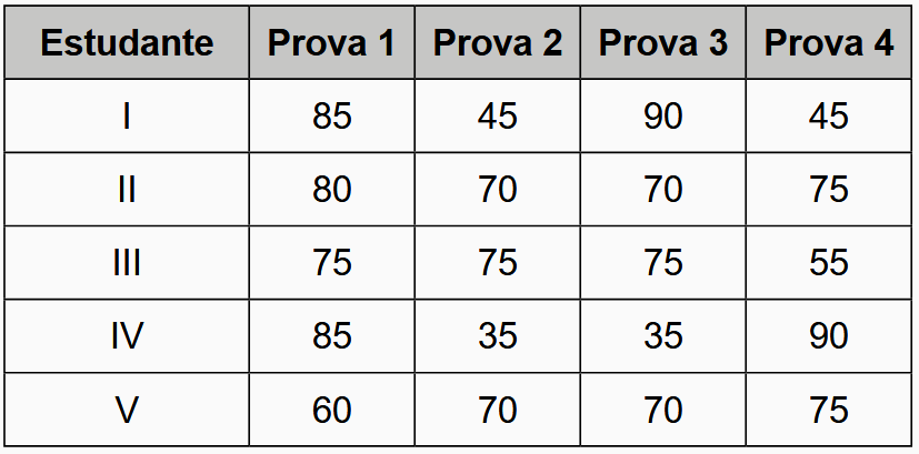 A nota final de um estudante em uma disciplina é dada pela mediana das notas de suas quatro provas. Cinco estudantes dessa disciplina obtiveram as notas apresentadas no quadro.