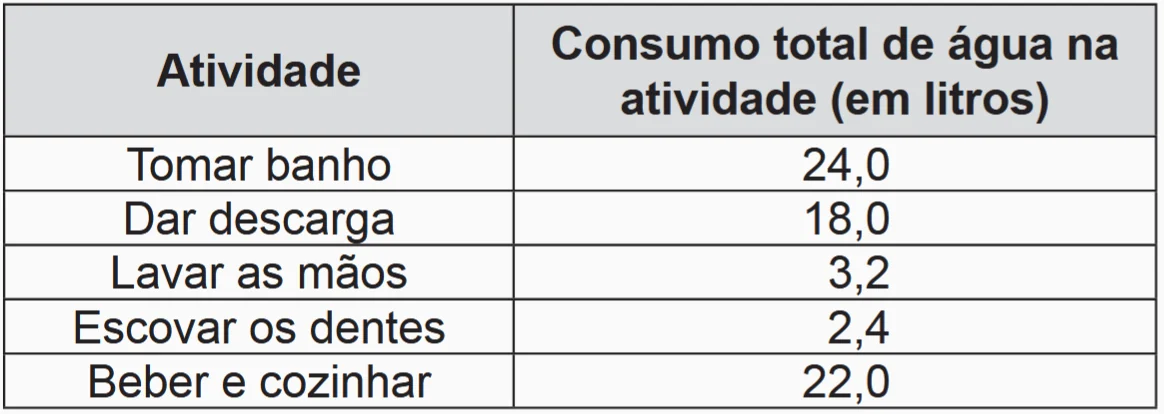 Se cada brasileiro adotar o consumo de água indicado no quadro, mantendo o mesmo consumo nas demais atividades, então economizará diariamente, em média, em litros de água,