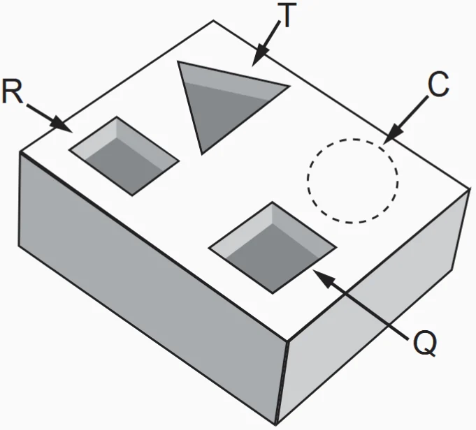 Um marceneiro está construindo um material didático que corresponde ao encaixe de peças de madeira com 10 cm de altura e formas geométricas variadas, num bloco de madeira em que cada peça se posicione na perfuração com seu formato correspondente, conforme ilustra a figura. O bloco de madeira já possui três perfurações prontas de bases distintas: uma quadrada (Q), de lado 4 cm, uma retangular (R), com base 3 cm e altura 4 cm, e uma em forma de um triângulo equilátero (T), de lado 6,8 cm. Falta realizar uma perfuração de base circular (C).