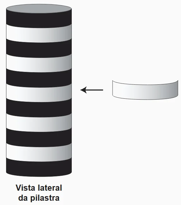O dono de um salão de festas precisa decorar cinco pilastras verticais cilíndricas idênticas, cujo raio da base mede 10 cm e a altura 3 m. O objetivo é revestir integralmente essas pilastras com faixas de menor comprimento possível, de modo que cada uma tenha seis faixas de cor preta e cinco faixas de cor branca, conforme ilustrado na figura.