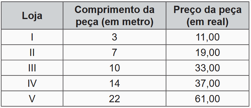 Ele orçou as faixas em cinco lojas que as comercializam na largura e nas cores desejadas, porém, em todas elas, só são vendidas peças inteiras. Os comprimentos e os respectivos preços das peças comercializadas por loja estão apresentados no quadro.
