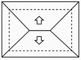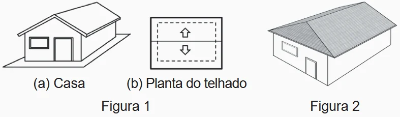 A Figura 1 apresenta uma casa e a planta do seu telhado, em que as setas indicam o sentido do escoamento da água de chuva. Um pedreiro precisa fazer a planta do escoamento da água de chuva de um telhado que tem três caídas de água, como apresentado na Figura 2.