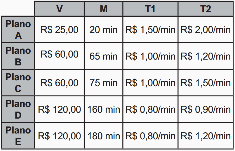 Uma operadora de telefonia oferece cinco planos de serviços. Em cada plano, para cada mês, o cliente paga um valor V que lhe dá direito a telefonar por M minutos para clientes da mesma operadora. Quando a duração total das chamadas para clientes da mesma operadora excede M minutos, é cobrada uma tarifa T1 por cada minuto excedente nesse tipo de chamada. Além disso, é cobrado um valor T2, por minuto, nas chamadas para clientes de outras operadoras, independentemente do fato de os M minutos terem ou não sido usados. A tabela apresenta o valor de V, M, T1 e T2 para cada um dos cinco planos.