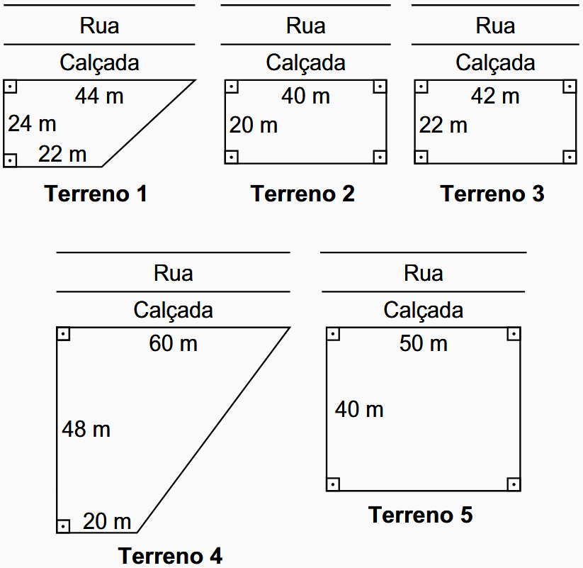 A gerência do Departamento de Obras de uma Prefeitura avalia adquirir um terreno e nele construir uma quadra oficial de futebol de salão. Há cinco terrenos disponíveis, e a gerência comprará o terreno que tiver menor área, desde que comporte a construção da quadra garantindo todas as demandas que ofereçam segurança aos atletas. Planeja-se ainda que a quadra seja construída de modo que o seu lado maior seja paralelo à rua. A figura ilustra os terrenos disponíveis e que estão sendo avaliados. Qual dos cinco terrenos a gerência deve adquirir a fim de atender a todas as exigências apresentadas?