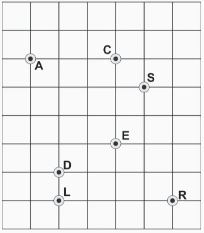 No labirinto em um parque de diversões, representado pela malha quadriculada, encontram-se sete crianças: Ana, Carol, Samanta, Denise, Roberta, Eliana e Larissa, representadas por pontos, identificados pela letra inicial do nome de cada uma delas. A malha é formada por quadrados, cujos lados medem 1 cm.