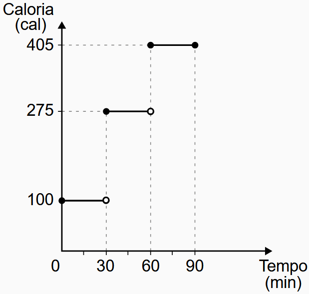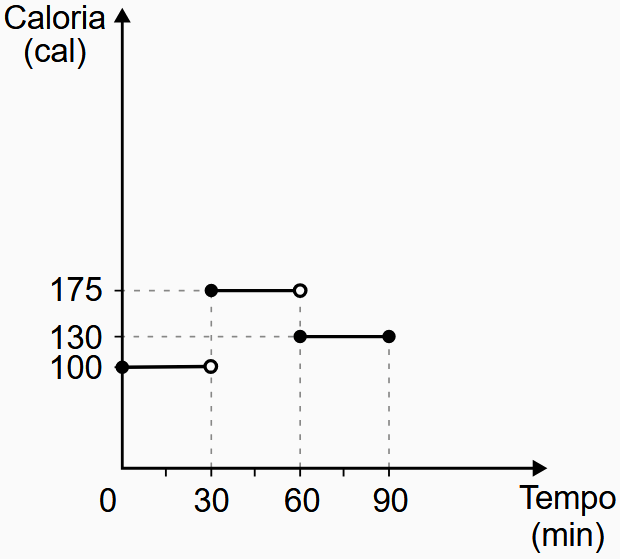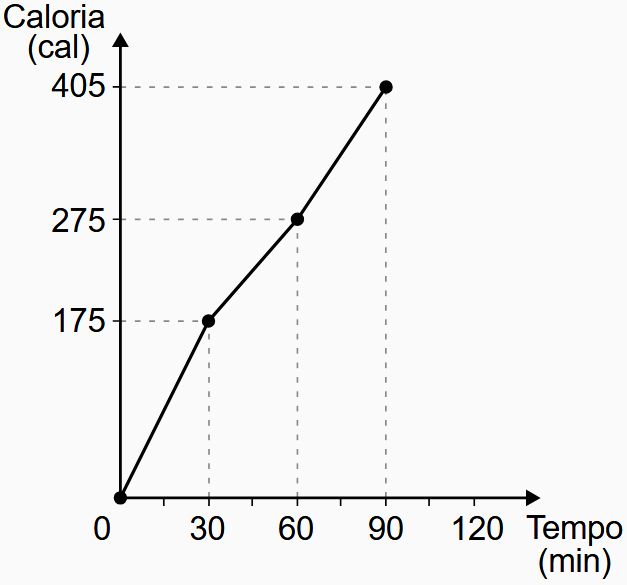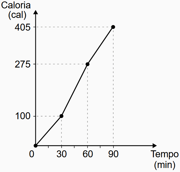 Veja o gasto médio de calorias, por hora de atividade, quando são exercidas algumas atividades domésticas: • varrer o chão: 200 calorias; • passar aspirador de pó: 350 calorias; • limpar janelas: 260 calorias. Uma pessoa varreu o chão da casa, depois passou o aspirador de pó e, por fim, limpou as janelas, gastando 30 minutos em cada atividade, sem parar para descansar. Considere que o gasto de calorias em uma atividade varie proporcionalmente em relação ao tempo. O gráfico que melhor representa o gasto acumulado de calorias dessa pessoa durante as atividades desenvolvidas é