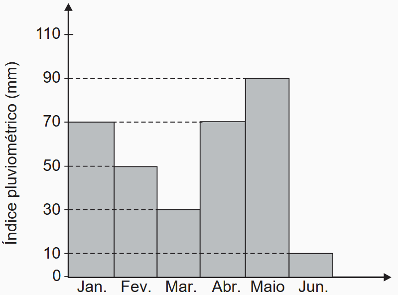 O índice pluviométrico é uma medida, em milímetro, que fornece a quantidade de precipitação de chuva num determinado local e num intervalo de tempo (hora, dia, mês e/ou ano). Os valores mensais do índice pluviométrico de uma cidade brasileira, no primeiro semestre, são mostrados no gráfico.