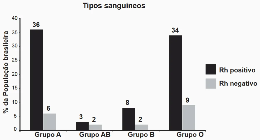 Uma revista publicará os dados, apresentados no gráfico, sobre como os tipos sanguíneos estão distribuídos entre a população brasileira. Contudo, o editor dessa revista solicitou que esse gráfico seja publicado na forma de setores, em que cada grupo esteja representado por um setor circular.
