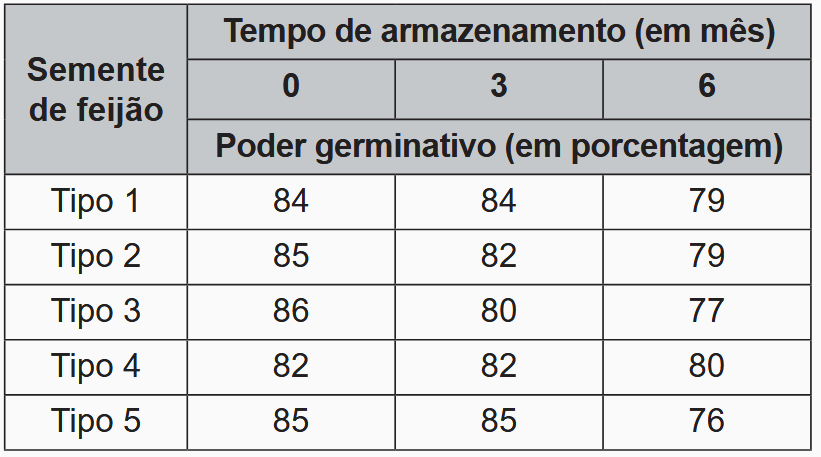 Os pesquisadores de uma empresa especializada em grãos selecionaram cinco diferentes tipos de semente de feijão e concluíram que, quando armazenadas por até seis meses, o poder germinativo de cada um desses tipos expressa, em porcentagem, quantas sementes são capazes de germinar, transcorrido o tempo de armazenamento correspondente. Considere que o tempo zero corresponde ao plantio direto da semente sem armazenamento, conforme descrito no quadro.