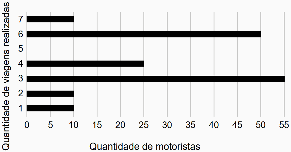 Uma empresa de transporte faz regularmente um levantamento do número de viagens realizadas durante o dia por todos os 160 motoristas cadastrados em seu aplicativo. Em um certo dia, foi gerado um relatório, por meio de um gráfico de barras, no qual se relacionaram a quantidade de motoristas com a quantidade de viagens realizadas até aquele instante do dia.