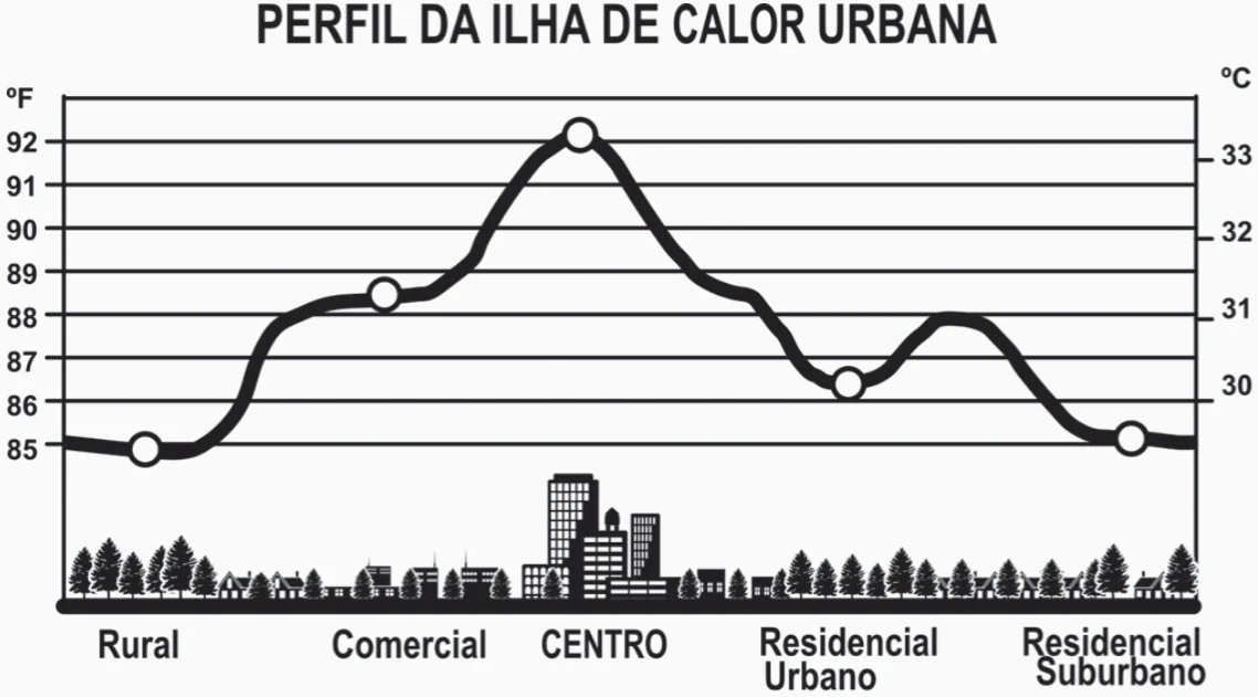 Rafael mora no Centro de uma cidade e decidiu se mudar, por recomendações médicas, para uma das regiões: Rural, Comercial, Residencial Urbano ou Residencial Suburbano. A principal recomendação médica foi com as temperaturas das “ilhas de calor” da região, que deveriam ser inferiores a \(31^{\circ}\text{C}\). Tais temperaturas são apresentadas no gráfico: