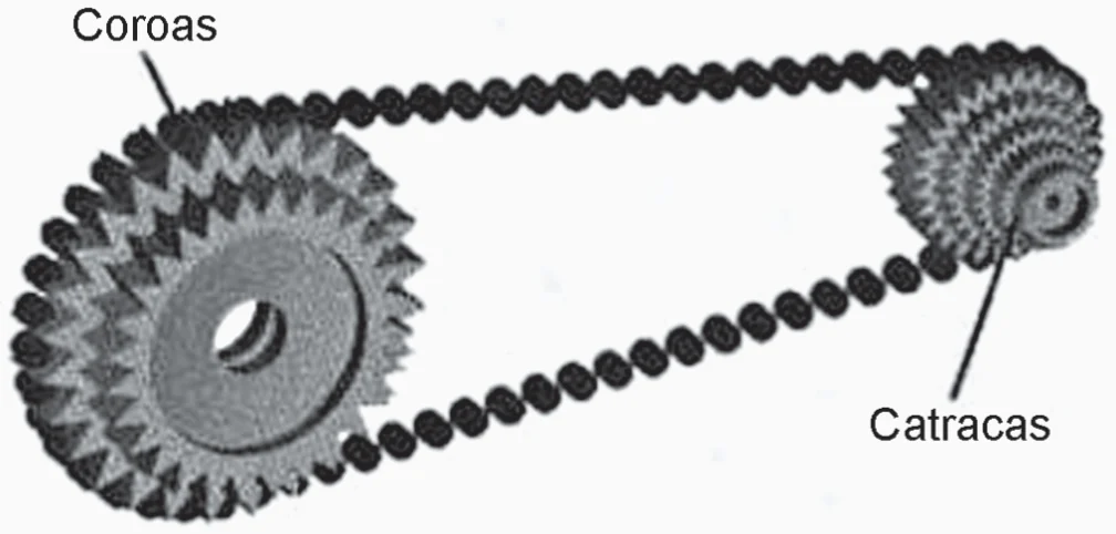 Uma bicicleta do tipo mountain bike tem uma coroa com 3 engrenagens e uma catraca com 6 engrenagens, que, combinadas entre si, determinam 18 marchas (número de engrenagens da coroa vezes o número de engrenagens da catraca).