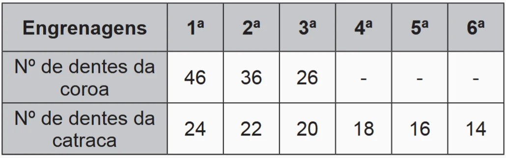 Os números de dentes das engrenagens das coroas e das catracas dessa bicicleta estão listados no quadro.