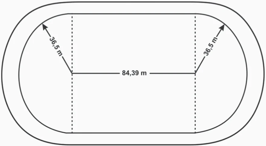 O atletismo é um dos esportes que mais se identificam com o espírito olímpico. A figura ilustra uma pista de atletismo. A pista é composta por oito raias e tem largura de 9,76 m. As raias são numeradas do centro da pista para a extremidade e são construídas de segmentos de retas paralelas e arcos de circunferência. Os dois semicírculos da pista são iguais.