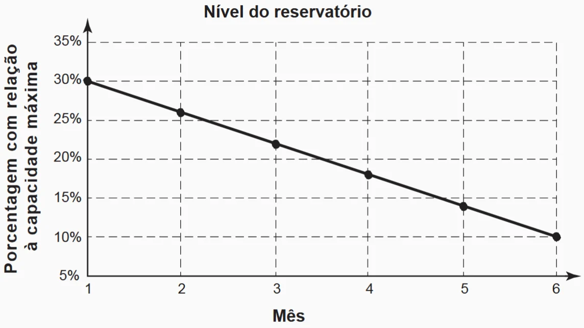 Um dos grandes desafios do Brasil é o gerenciamento dos seus recursos naturais, sobretudo os recursos hídricos. Existe uma demanda crescente por água e o risco de racionamento não pode ser descartado. O nível de água de um reservatório foi monitorado por um período, sendo o resultado mostrado no gráfico. Suponha que essa tendência linear observada no monitoramento se prolongue pelos próximos meses.