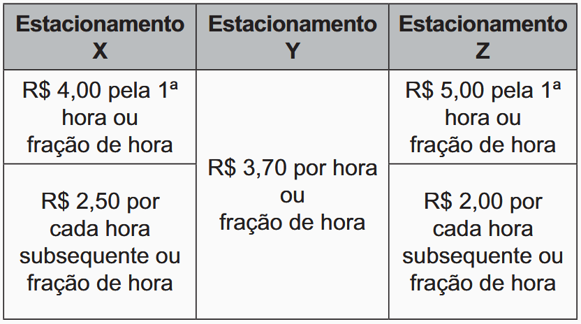 Para um evento que acontecerá no centro de uma cidade, há a opção de três estacionamentos, que cobram da seguinte maneira: