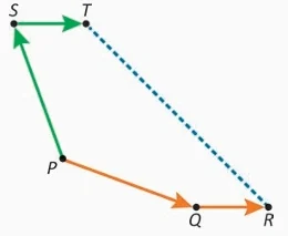 O dono de uma embarcação deve partir do ponto P e chegar ao ponto R por meio de dois deslocamentos lineares e navegando a uma velocidade constante. Essa viagem será feita durante a noite, e como ele dispõe somente de uma bússola e de um relógio, planejou sua rota da seguinte forma: 1º – partir do ponto P na direção 110 e navegar por 4 horas, alcançando um ponto Q; 2º – partir do ponto Q na direção 90 e navegar por 2 horas, alcançando o ponto de destino R. No entanto, ao direcionar o barco para o primeiro deslocamento, o fez na direção 340, em vez de 110. Com isso, realizou os seguintes deslocamentos: 1º – partiu do ponto P na direção 340 e navegou por 4 horas, alcançando um ponto S; 2º – partiu do ponto S na direção 90 e navegou por 2 horas, alcançando o ponto T. A figura apresenta a bússola, a rota planejada e a rota executada.